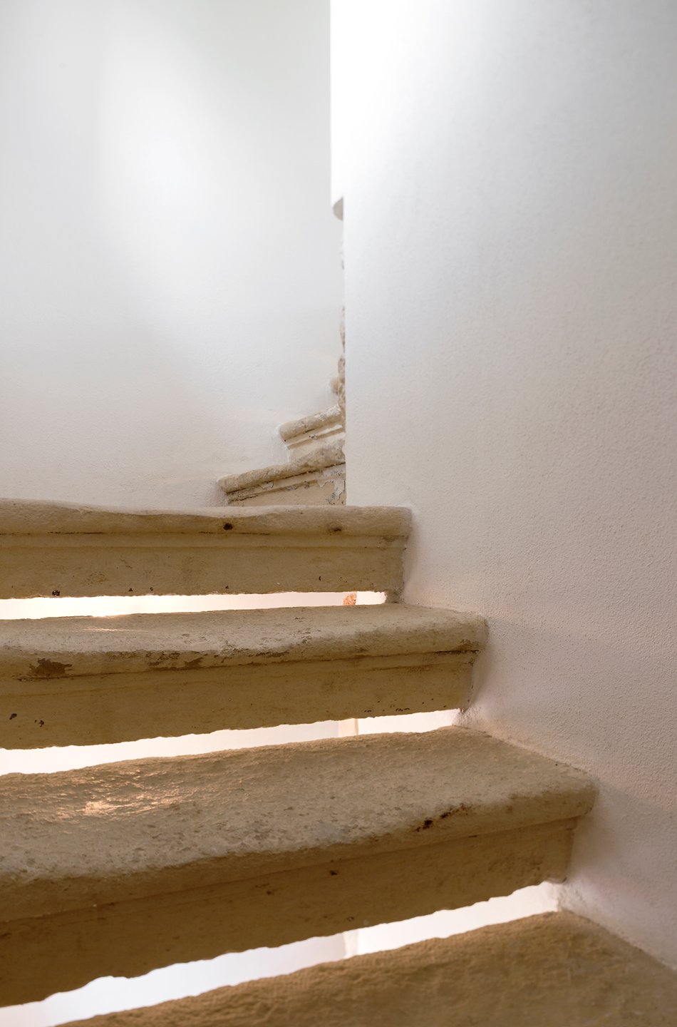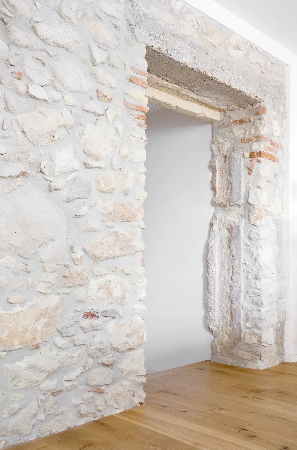An old house in a Valpolicella courtyard for a young couple. Soft shades and light colours, wood and local stone, as well as meticulous subtraction work to bring old wall textures back to light.