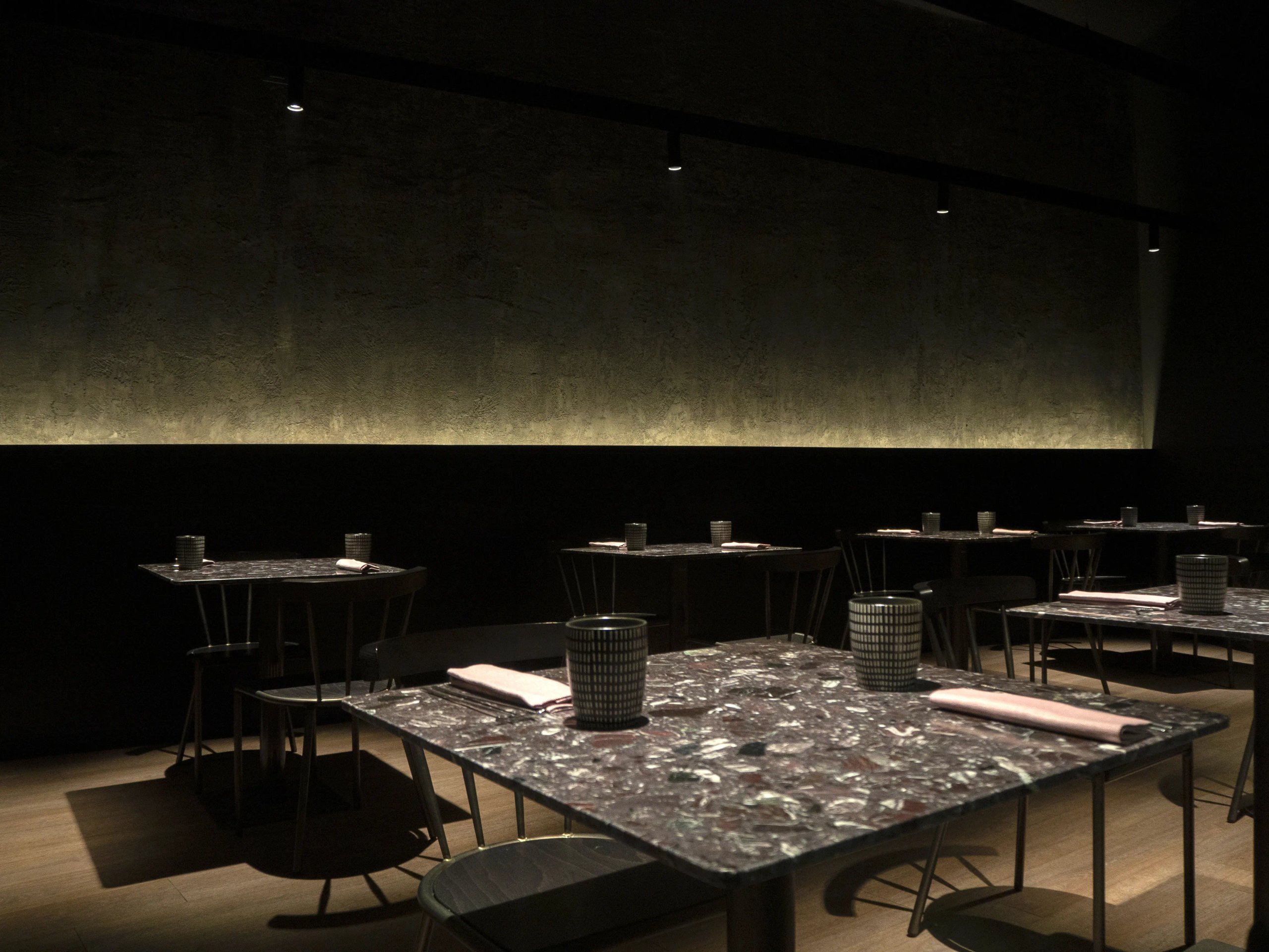 In line with the restaurant’s philosophy, the interior has been designed by combining a soft atmosphere with dark and embracing tones, with a more technical, industrial character: