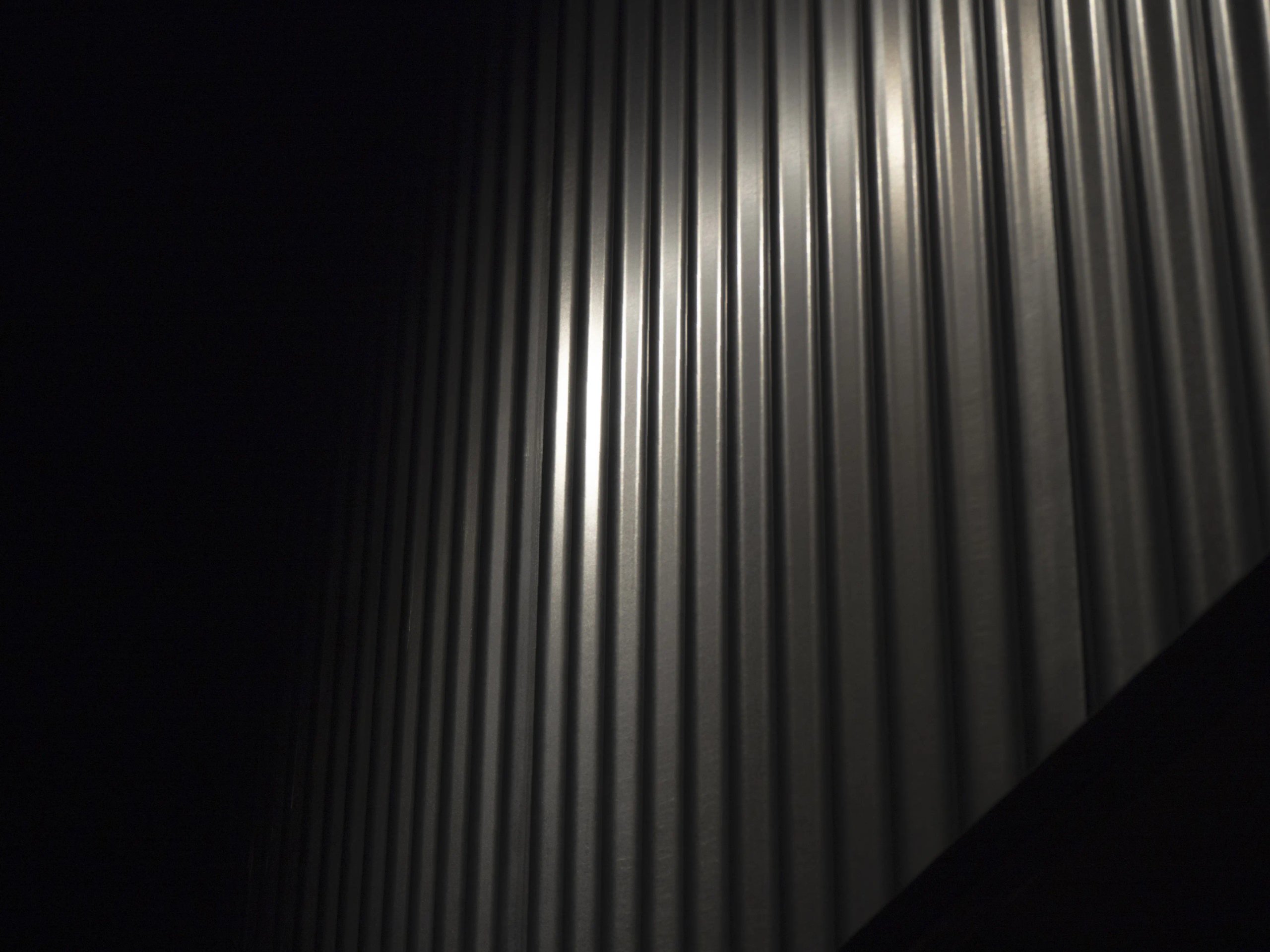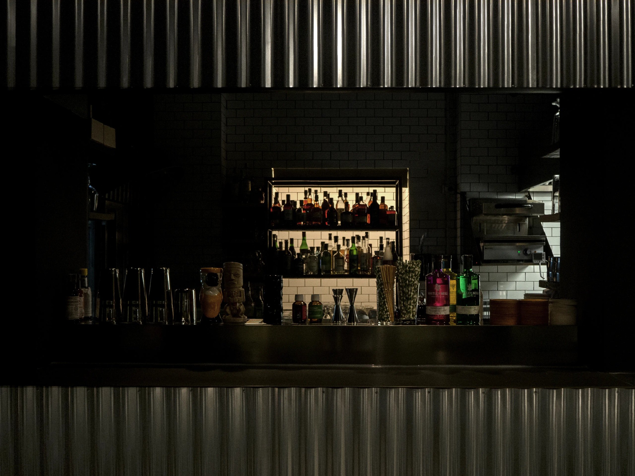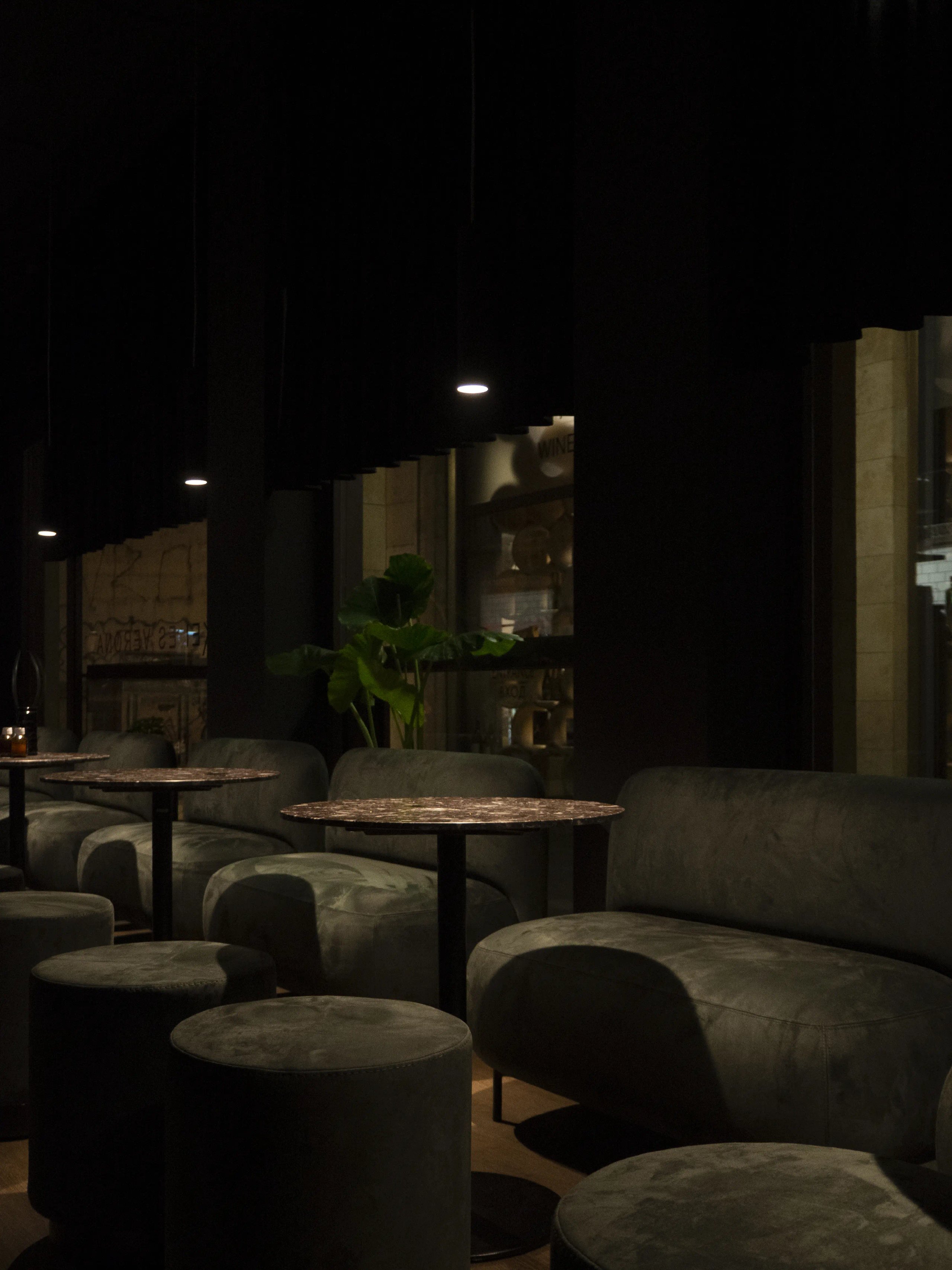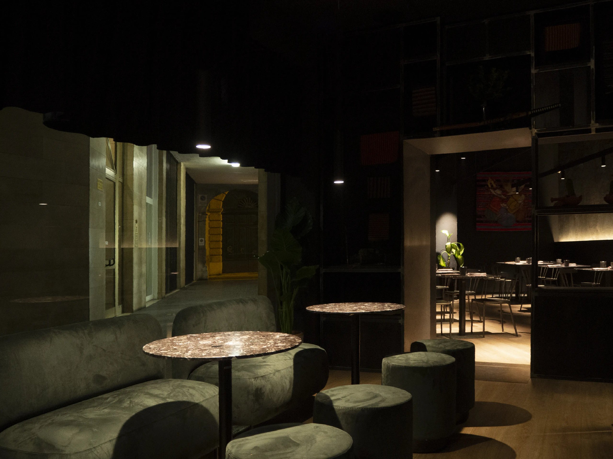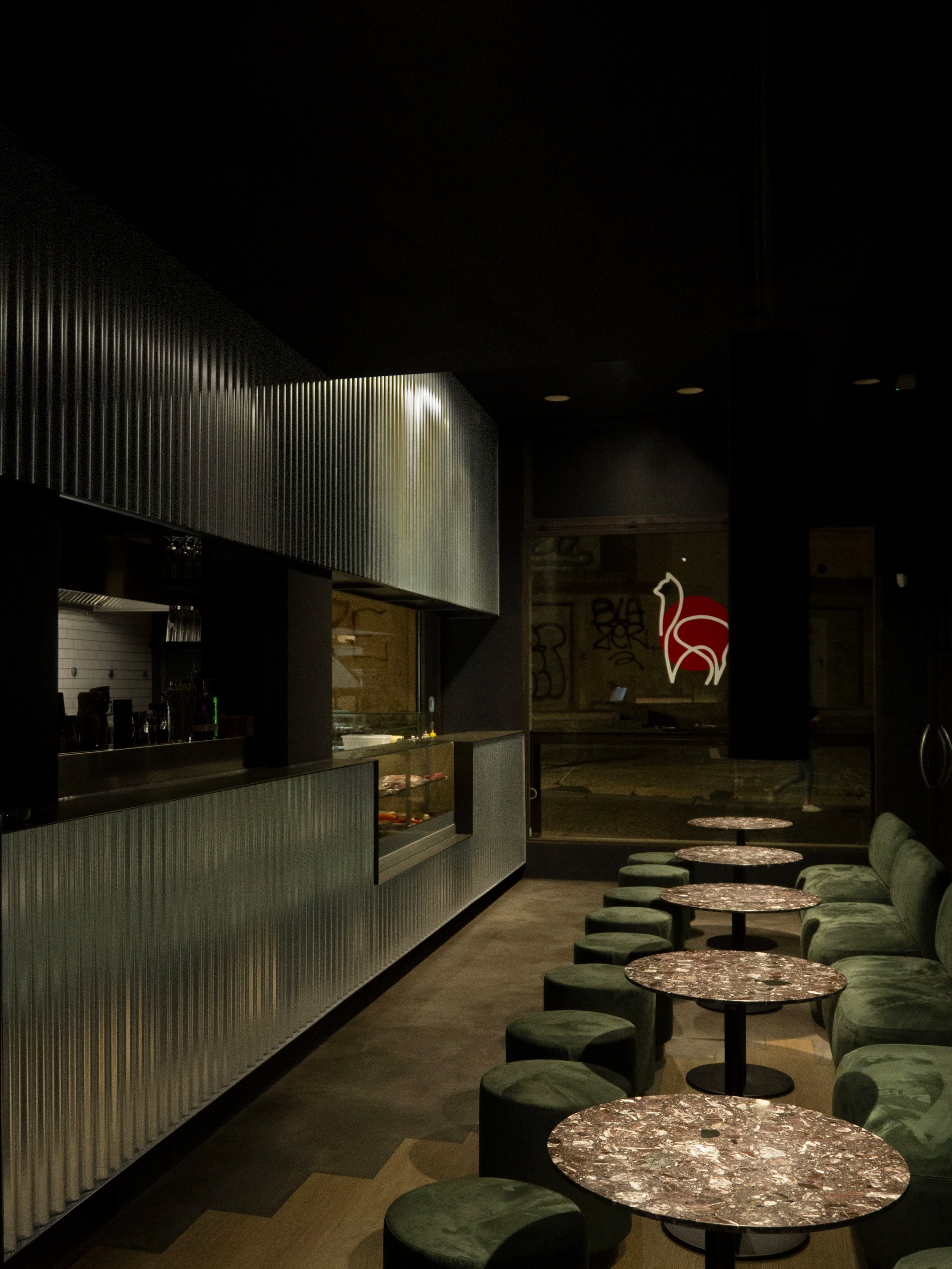 the use of black paint, spot lighting and velvet curtains mingle with the hard tones of the kitchen counter and the bar , made of corrugated galvanised sheet metal.