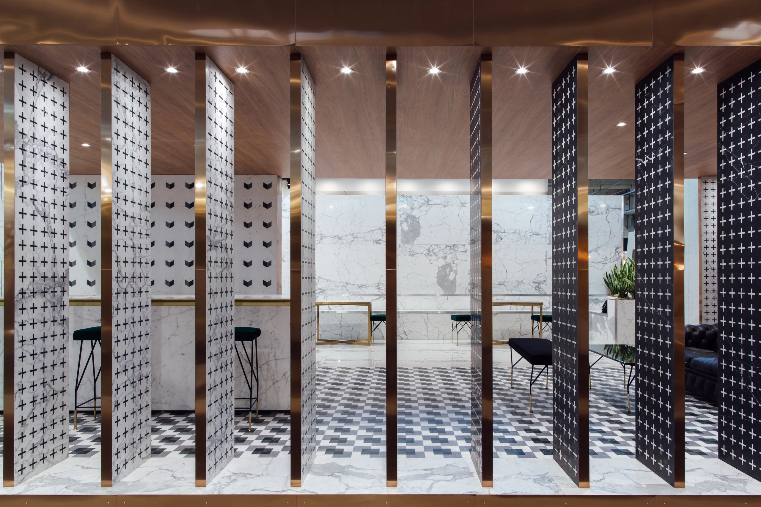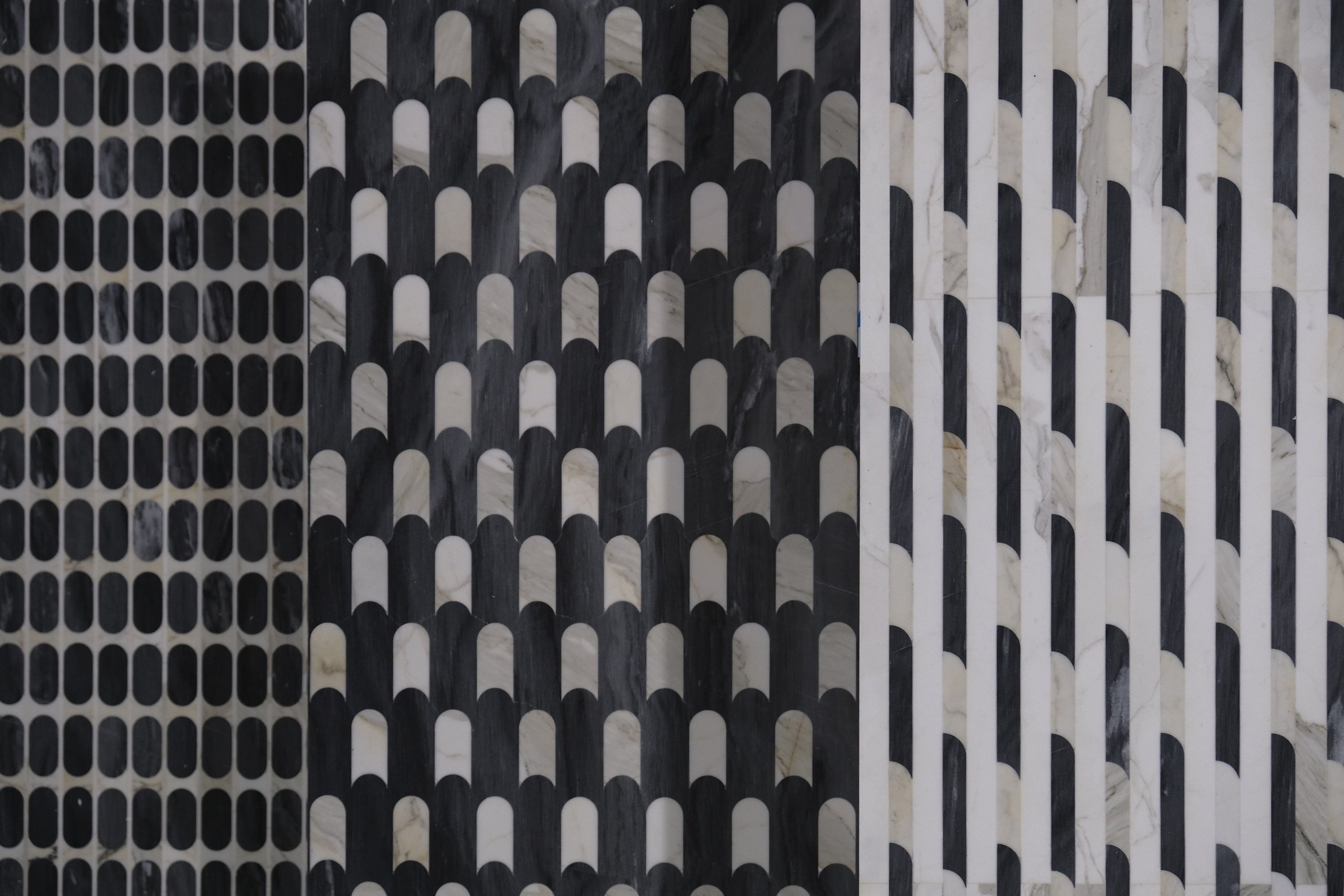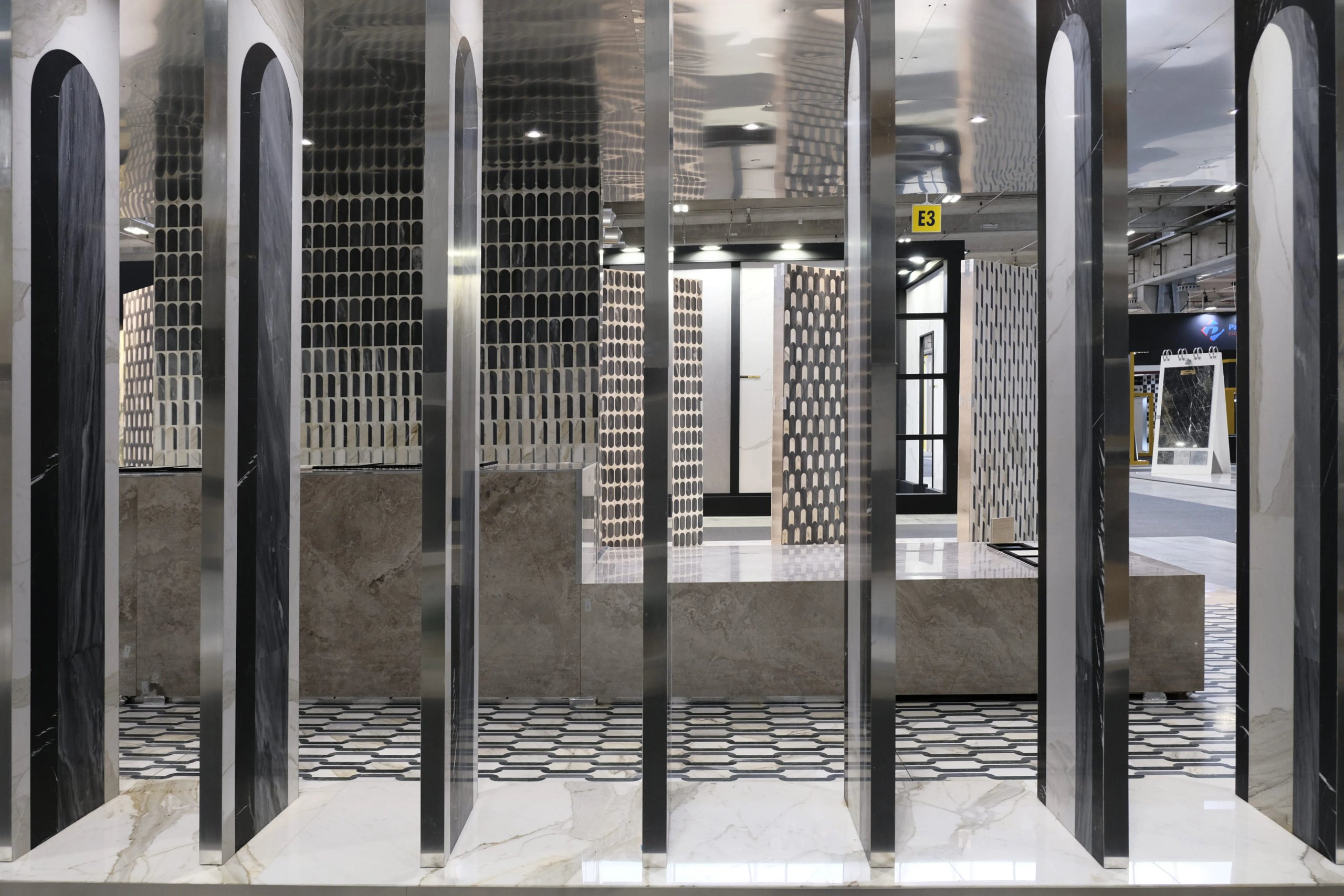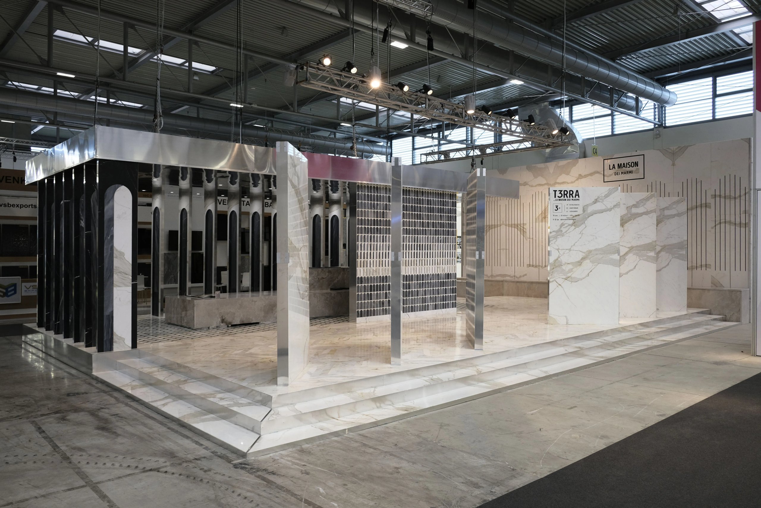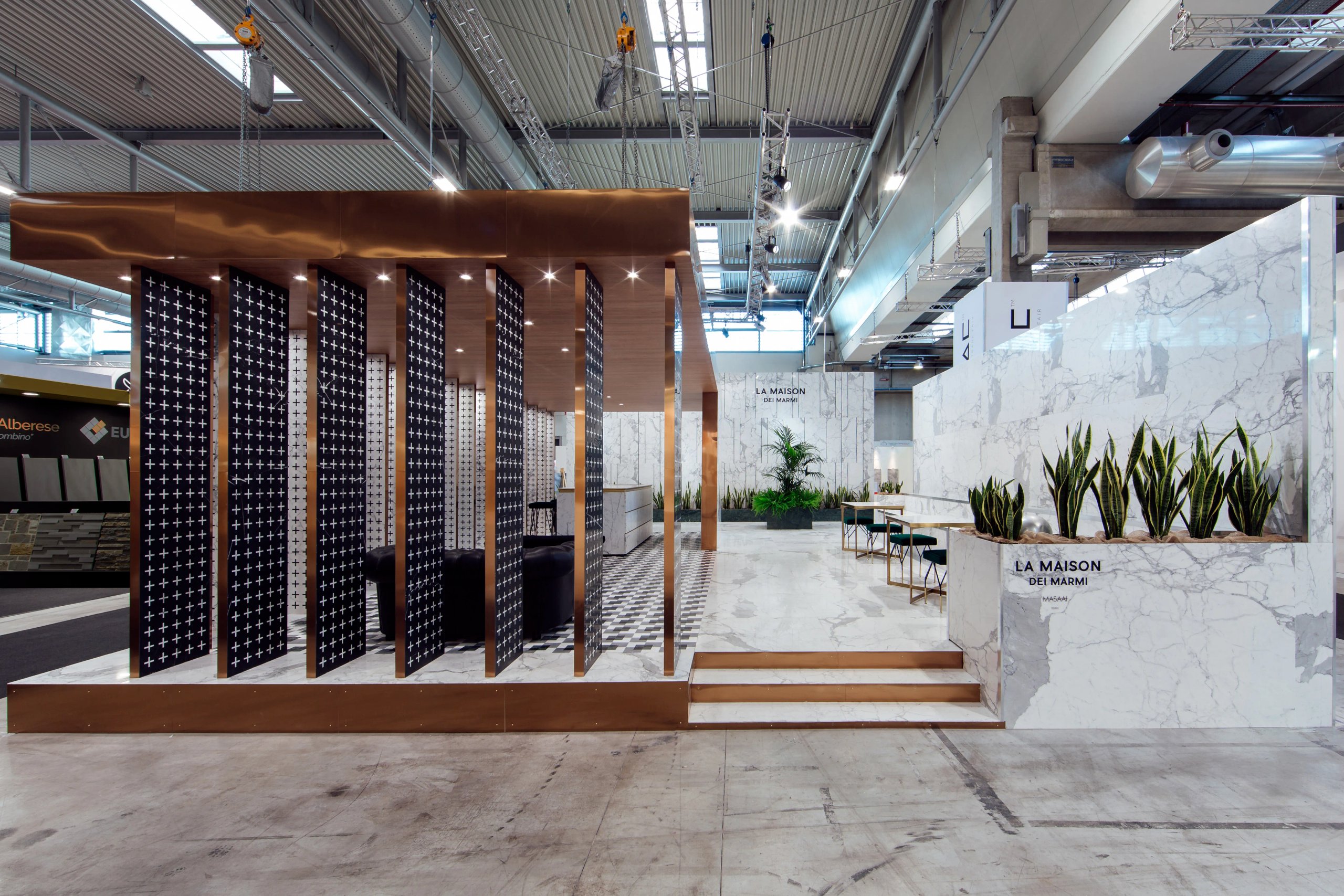 The structure was reused and readapted for two editions of Marmomacc, each time changing and rethinking the patterns and geometric motifs carved into the marble slabs, specially designed by the studio.