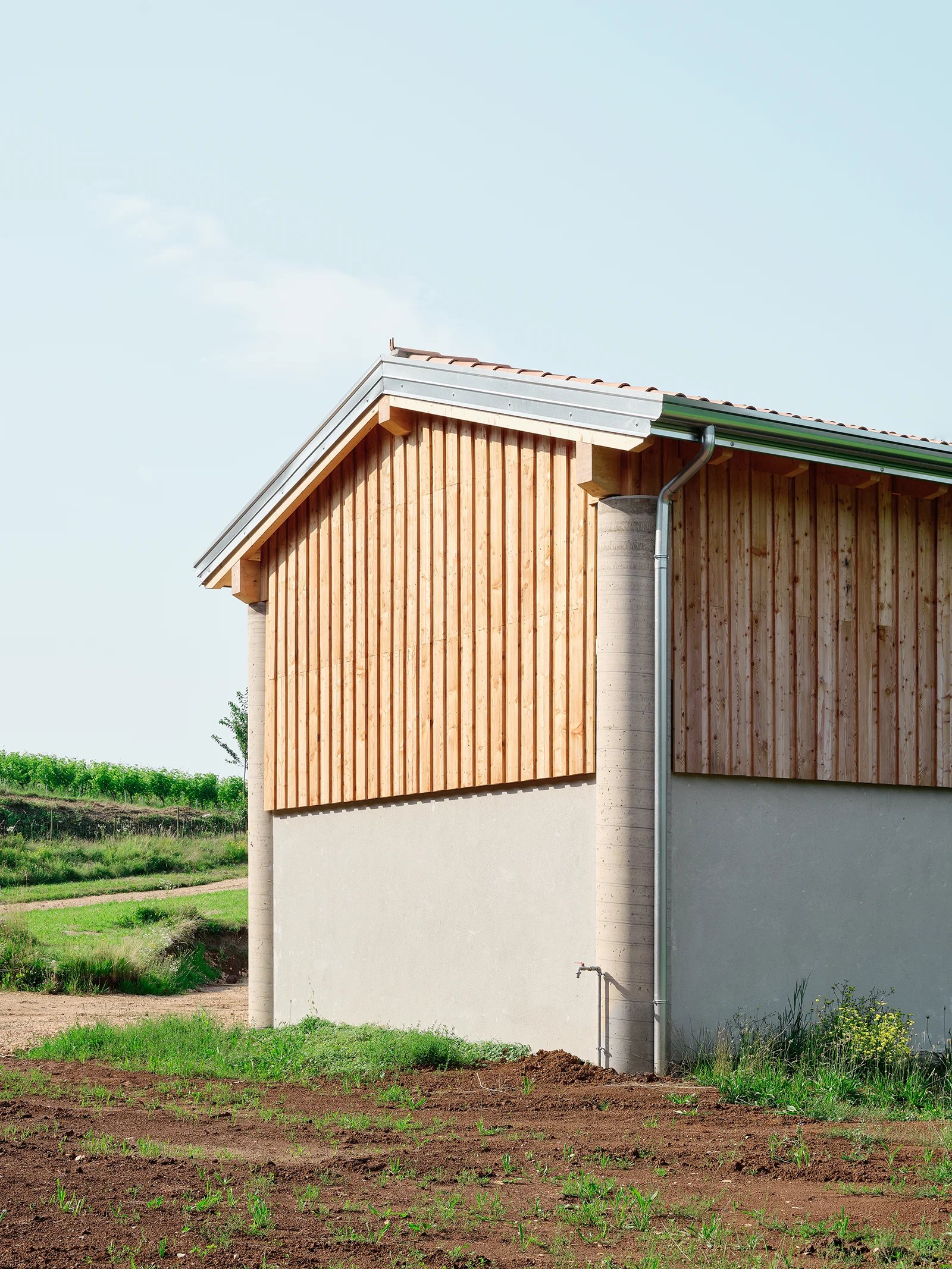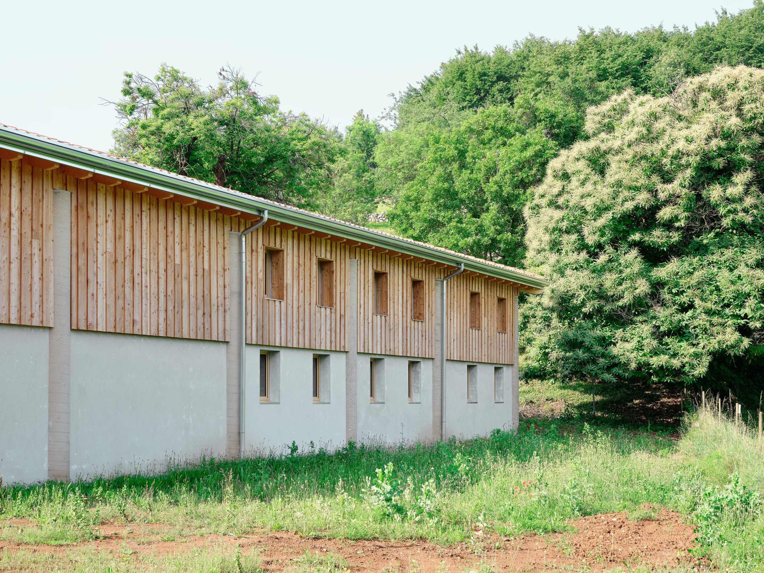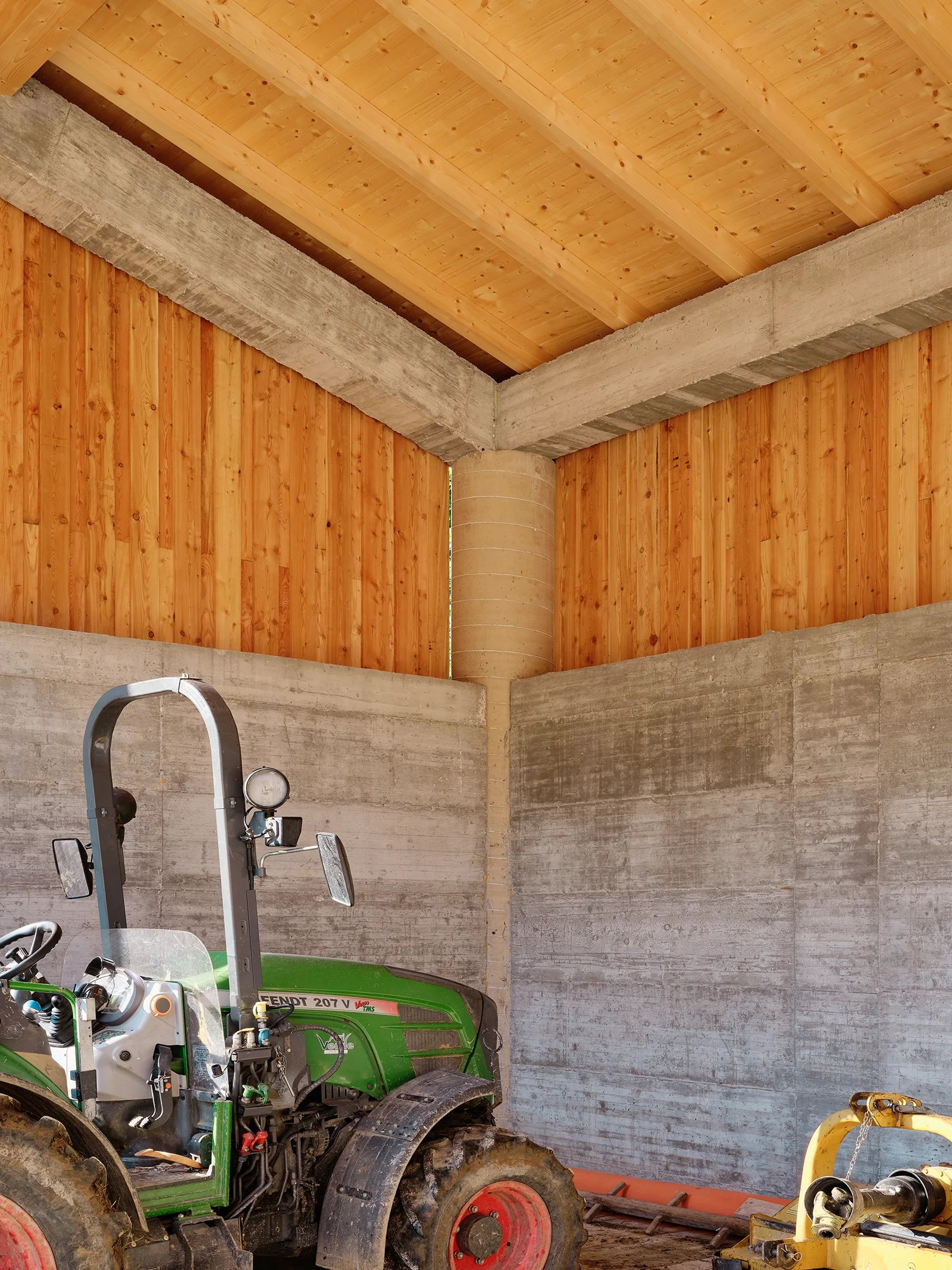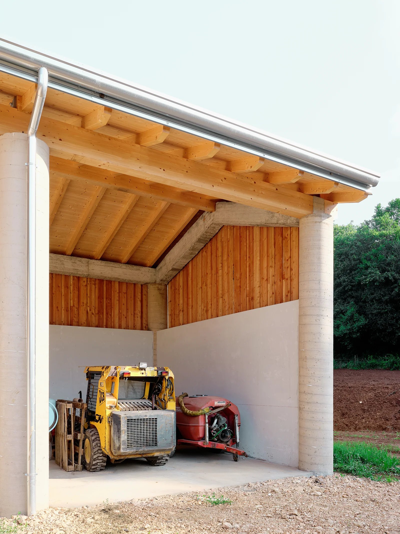 The building is L-shaped, with an internal side that opens up onto the gravel courtyard, permeable to the entrance of agricultural machinery, and an external side with a leaner and more closed character, buffered at the bottom by plastered masonry and at the top by natural larch planking.