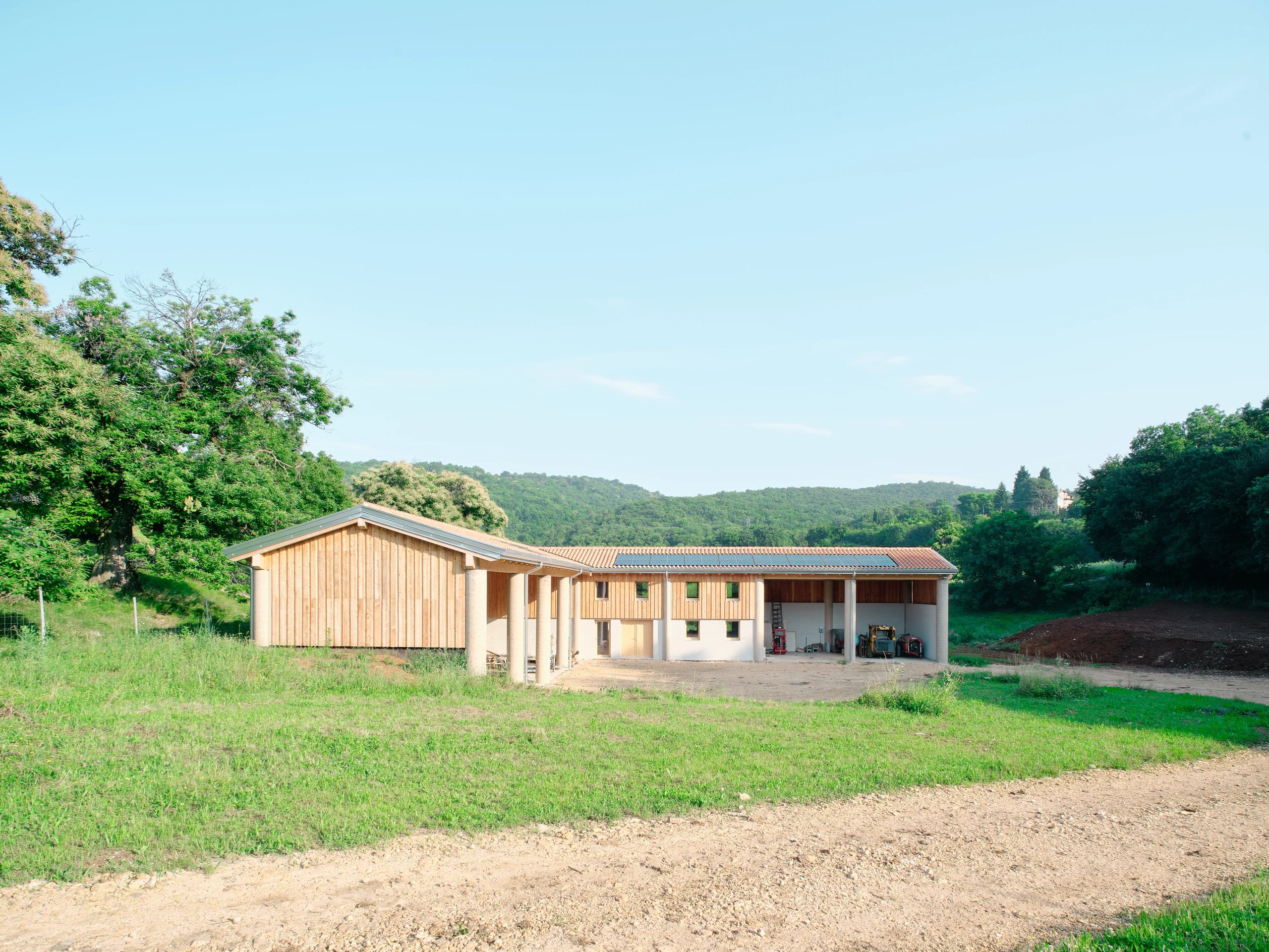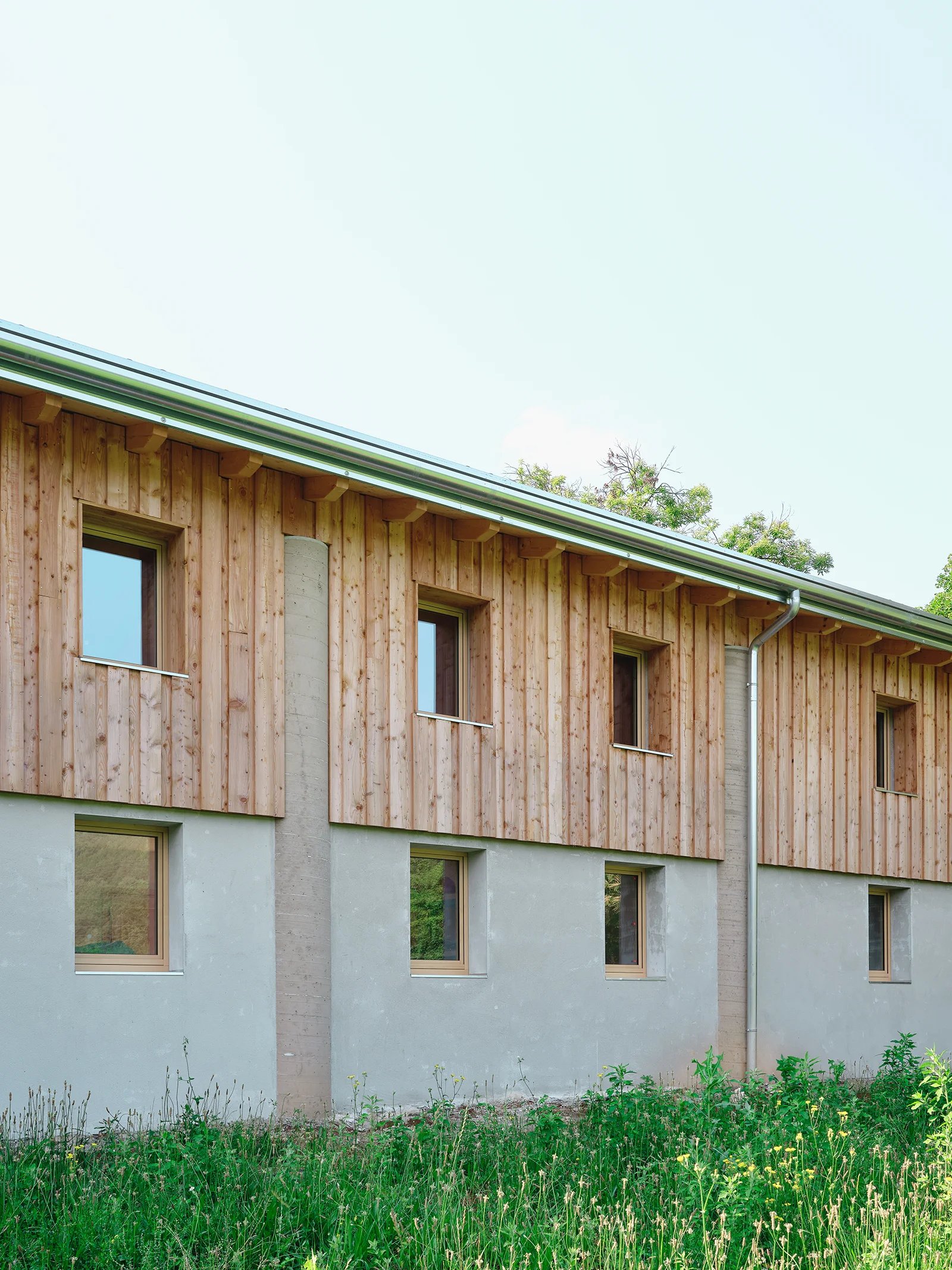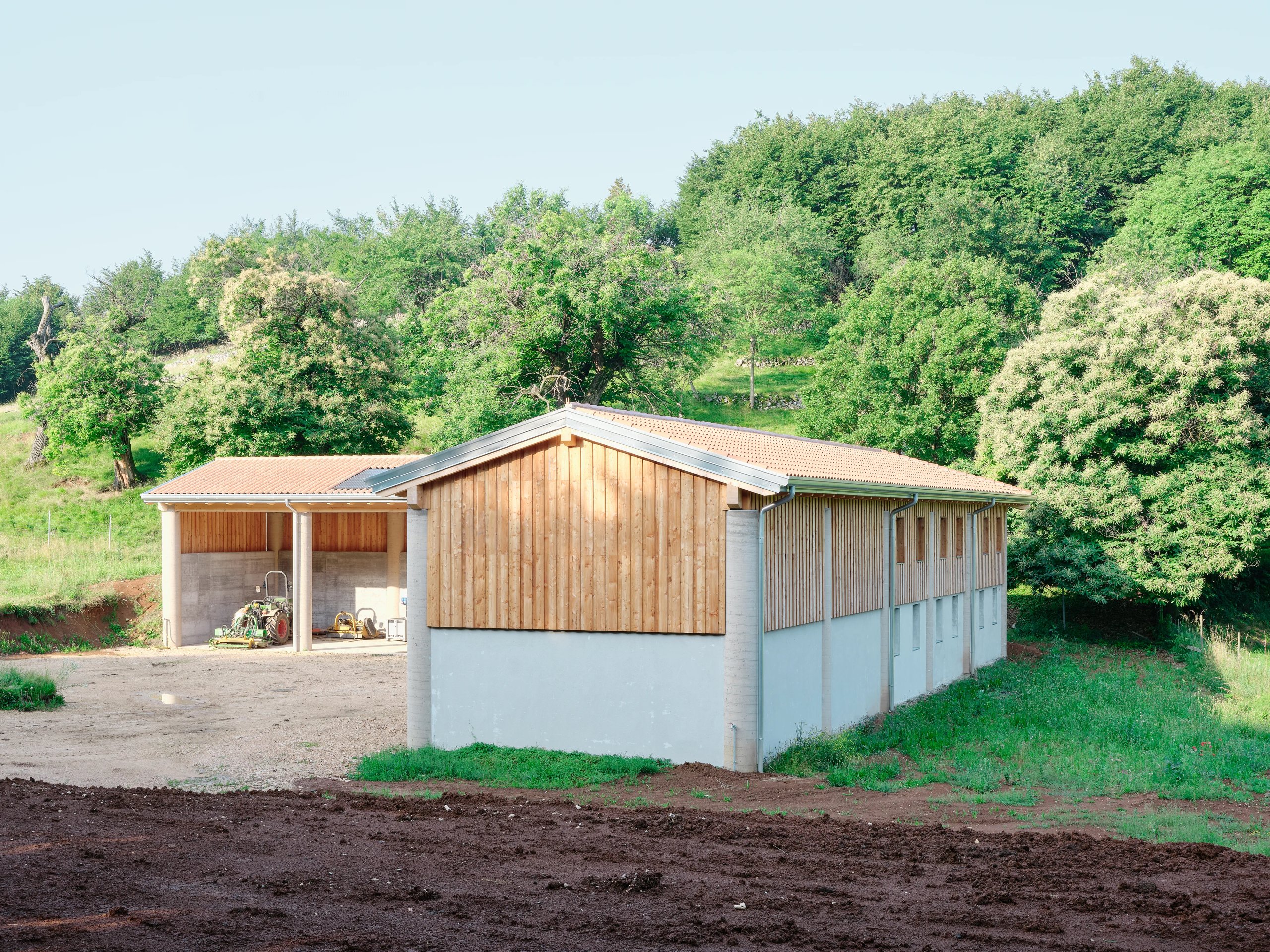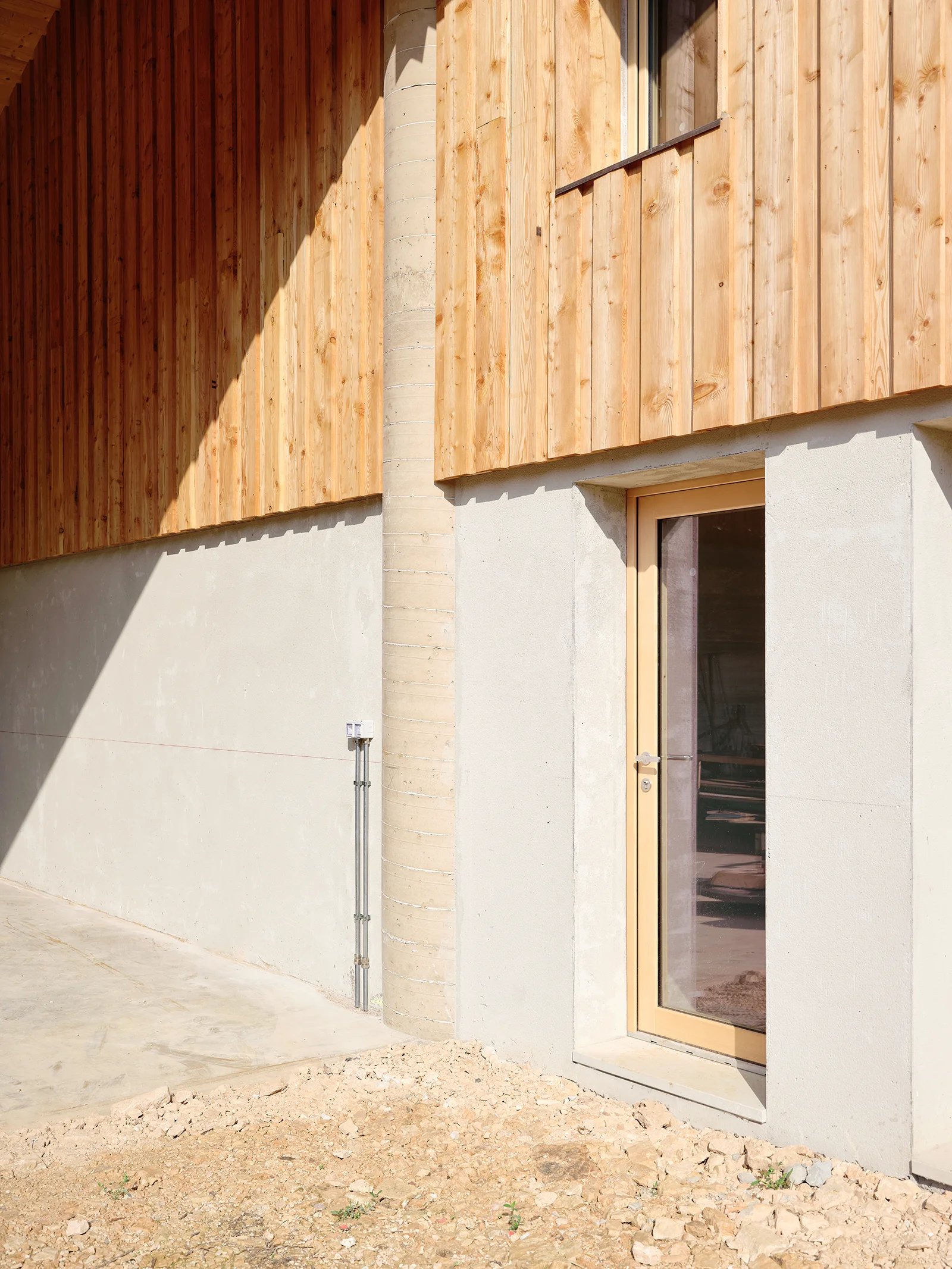 The building is L-shaped, with an internal side that opens up onto the gravel courtyard, permeable to the entrance of agricultural machinery, and an external side with a leaner and more closed character, buffered at the bottom by plastered masonry and at the top by natural larch planking.